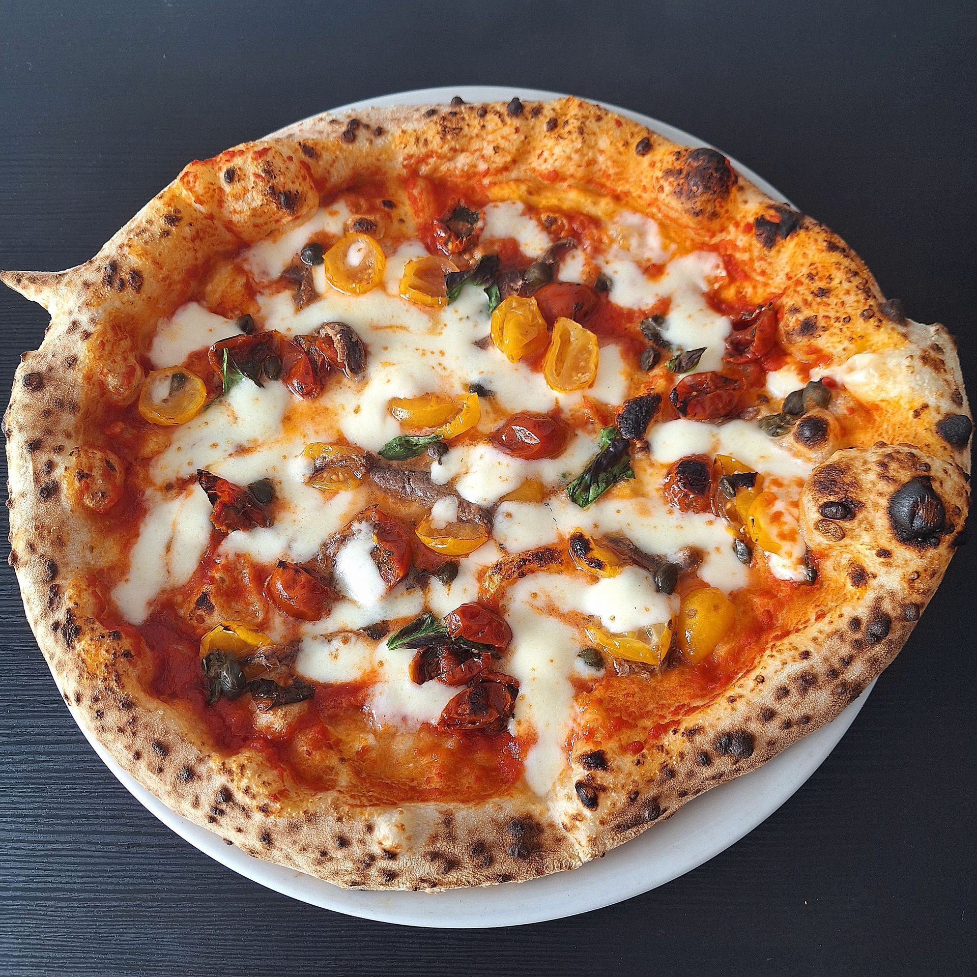 Pomodoro San Marzano stracotto, Fiordilatte di Agerola, Pomodorini rossi e gialli semi dry, Capperi, Alici, Basilico, Olio Evo