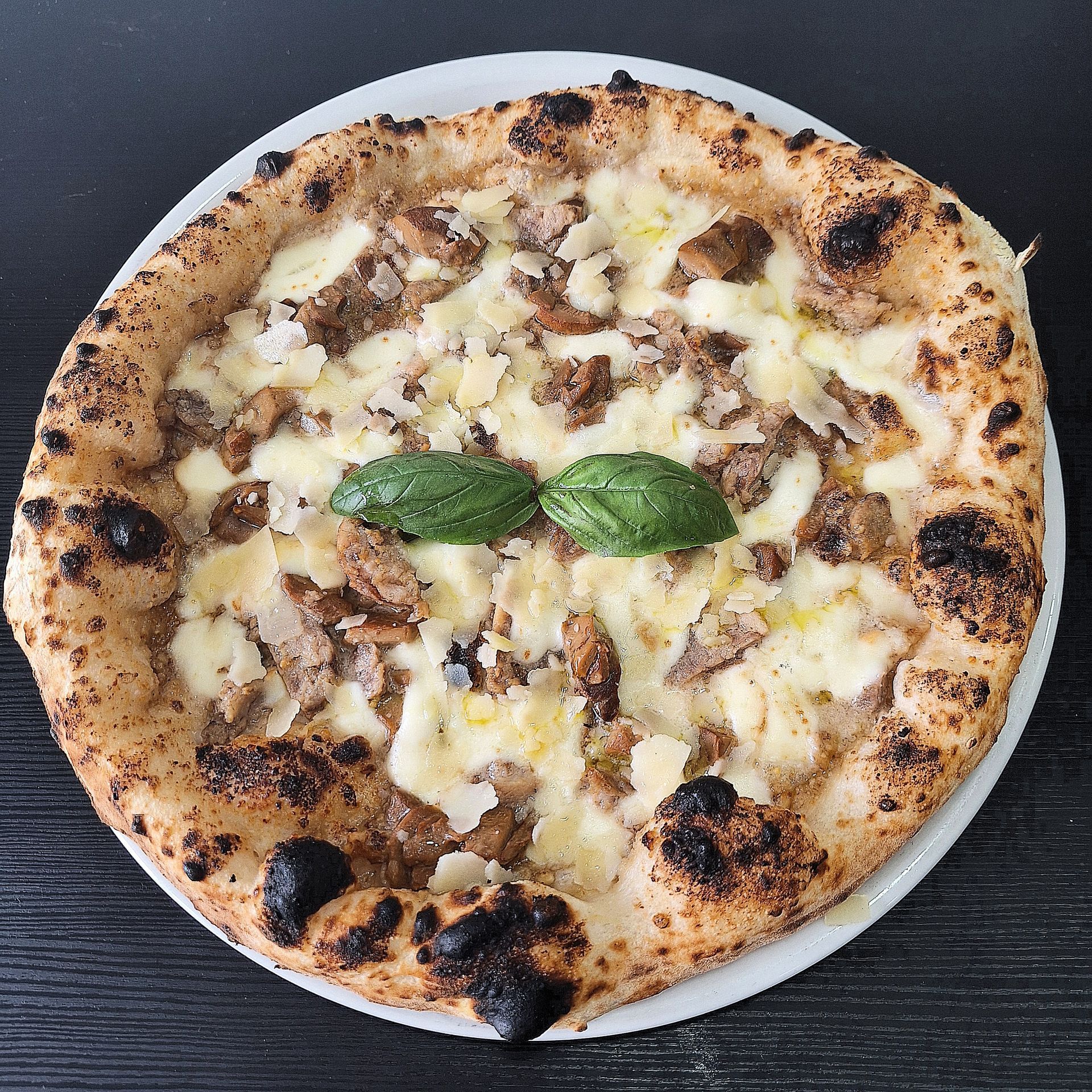 Crema di Noci, Provola di Agerola, Funghi Porcini, Salsiccia, Basilico, Olio Evo, all'uscita scaglie di Grana