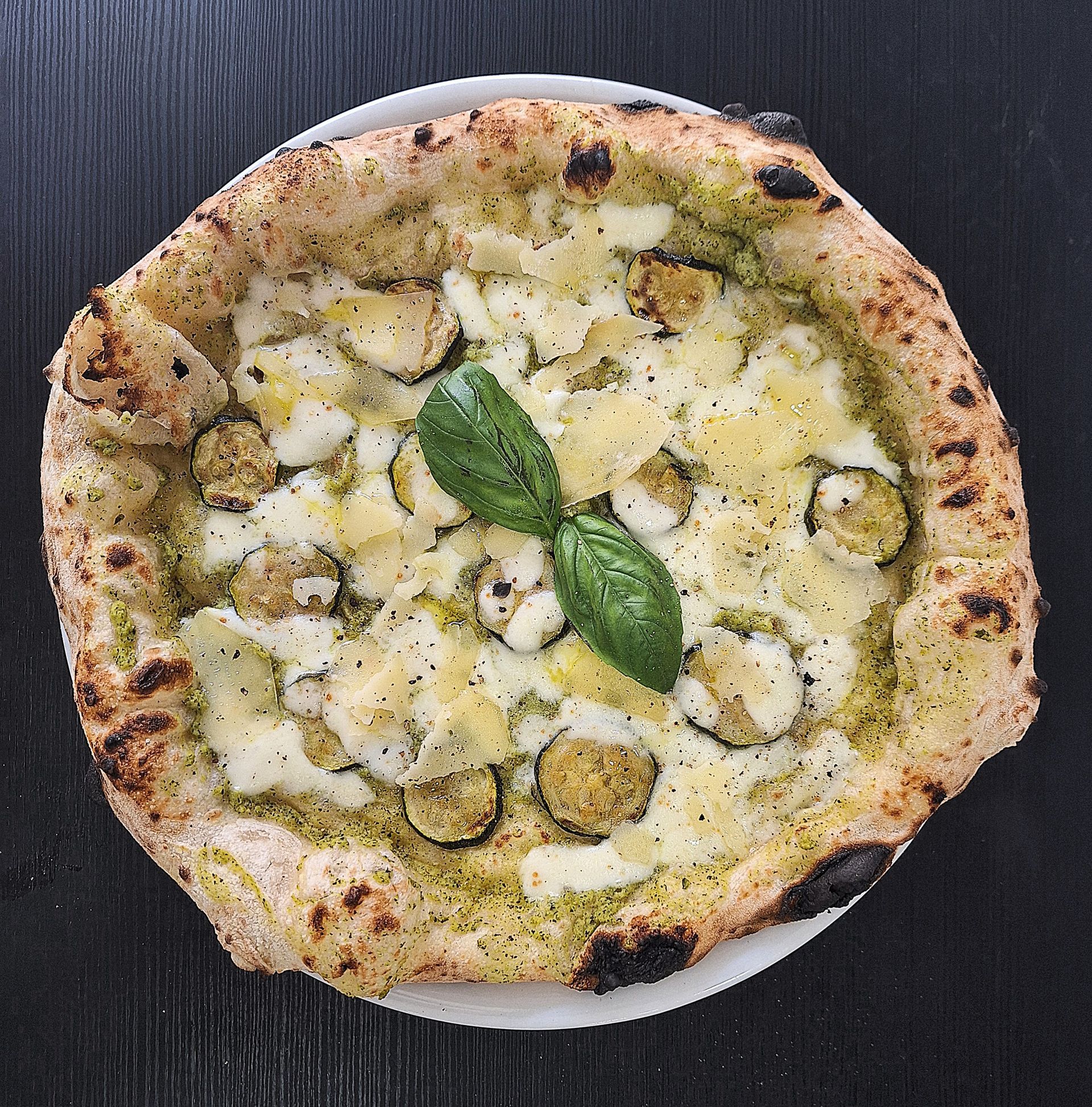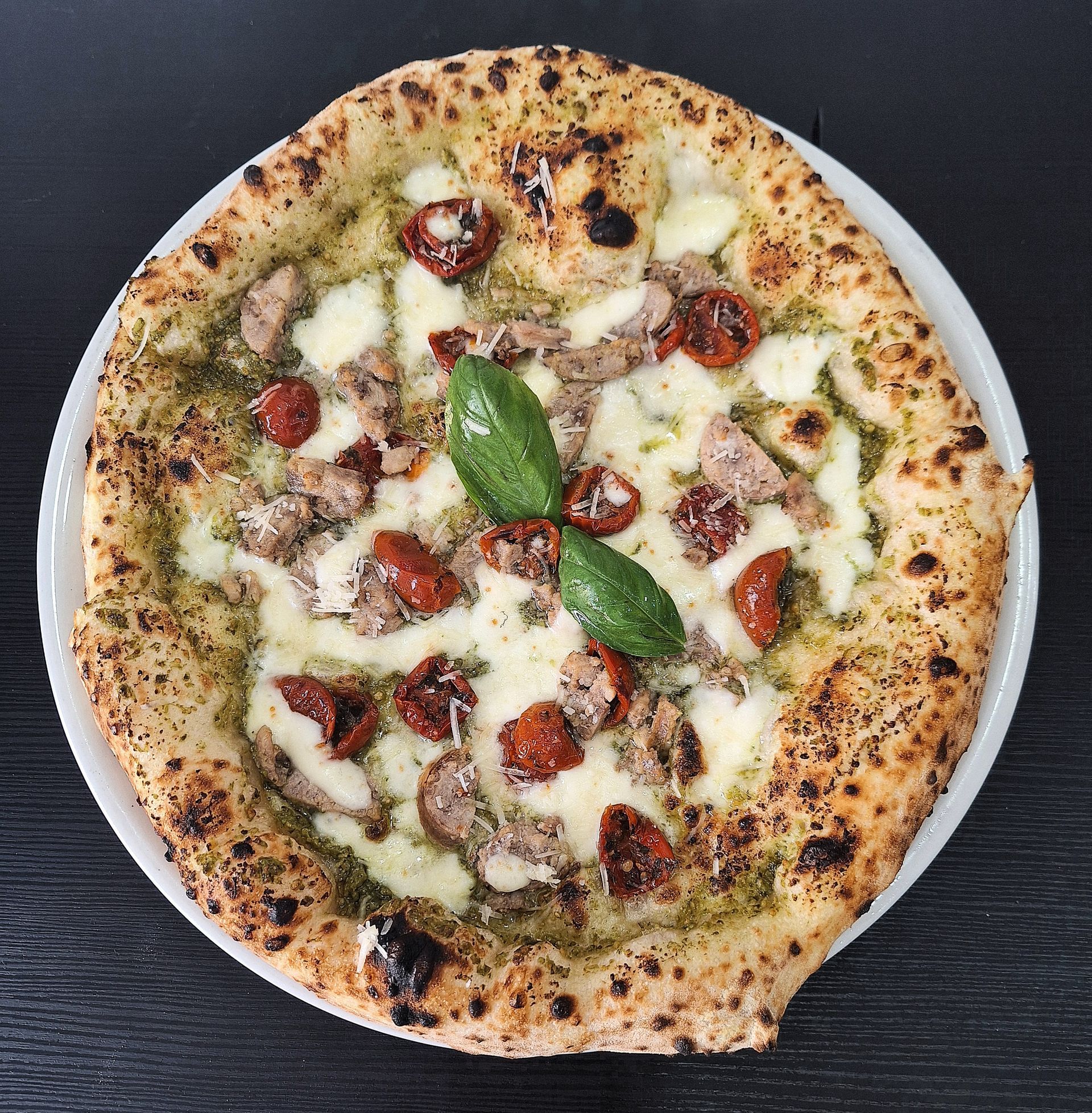 Crema di pesto di basilico, Fiordilatte di Agerola, Salsiccia, Pomodorini rossi semi dry, Spolverata di Grana, Basilico, Olio Evo