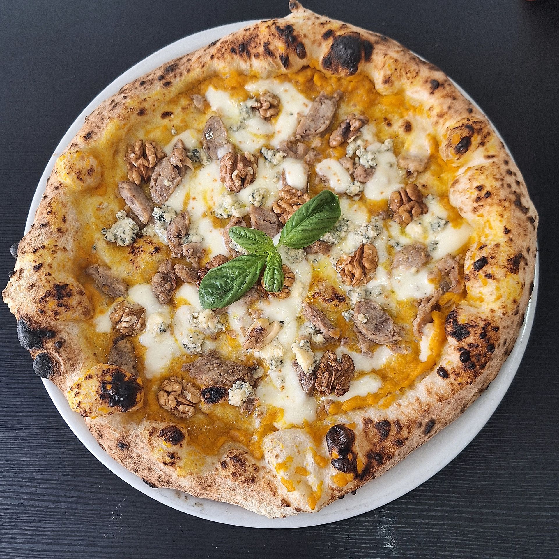Fiordilatte di Agerola, Crema di Zucca, Salsiccia, Gorgonzola, Basilico, Olio Evo, all'uscita Noci