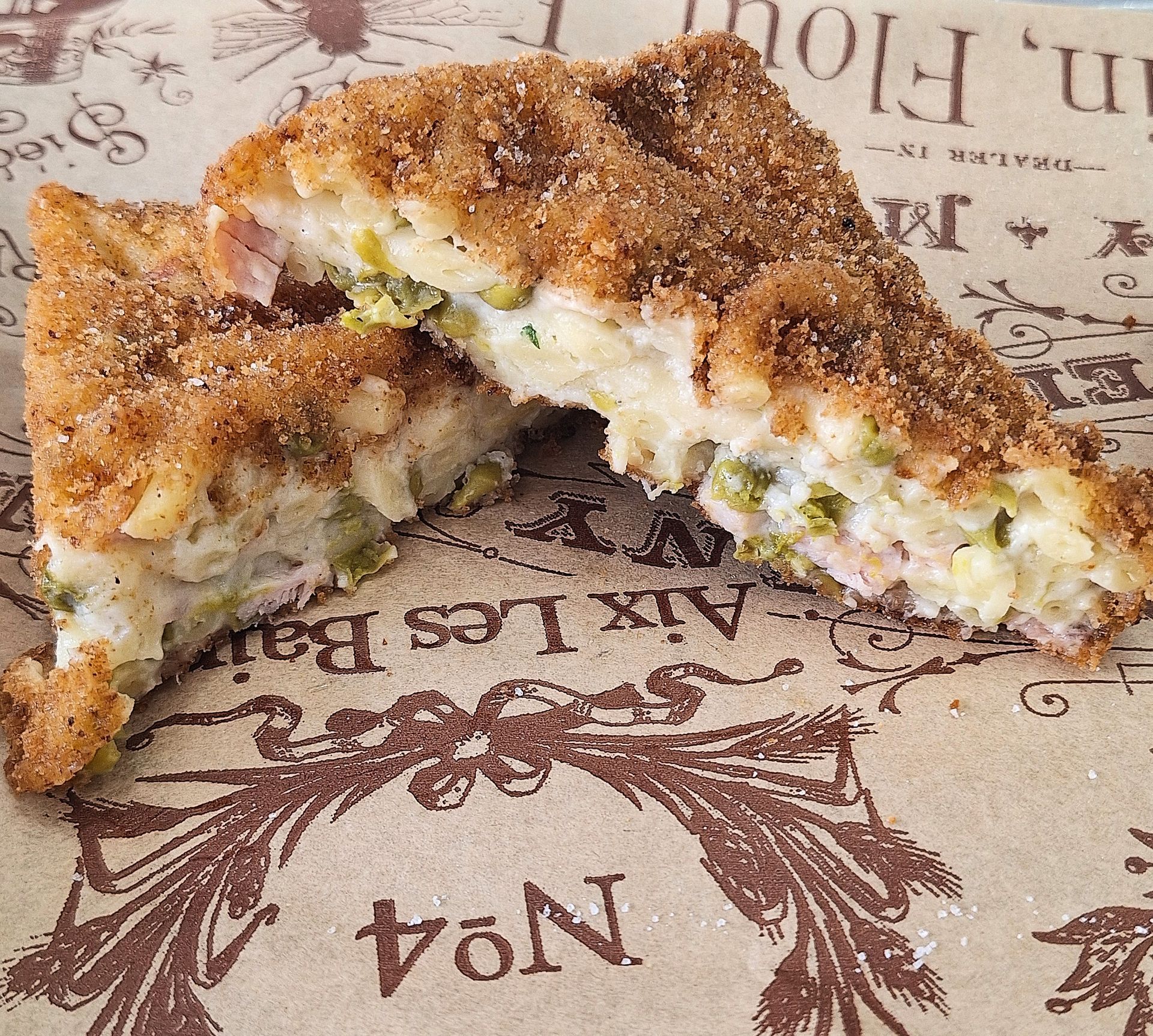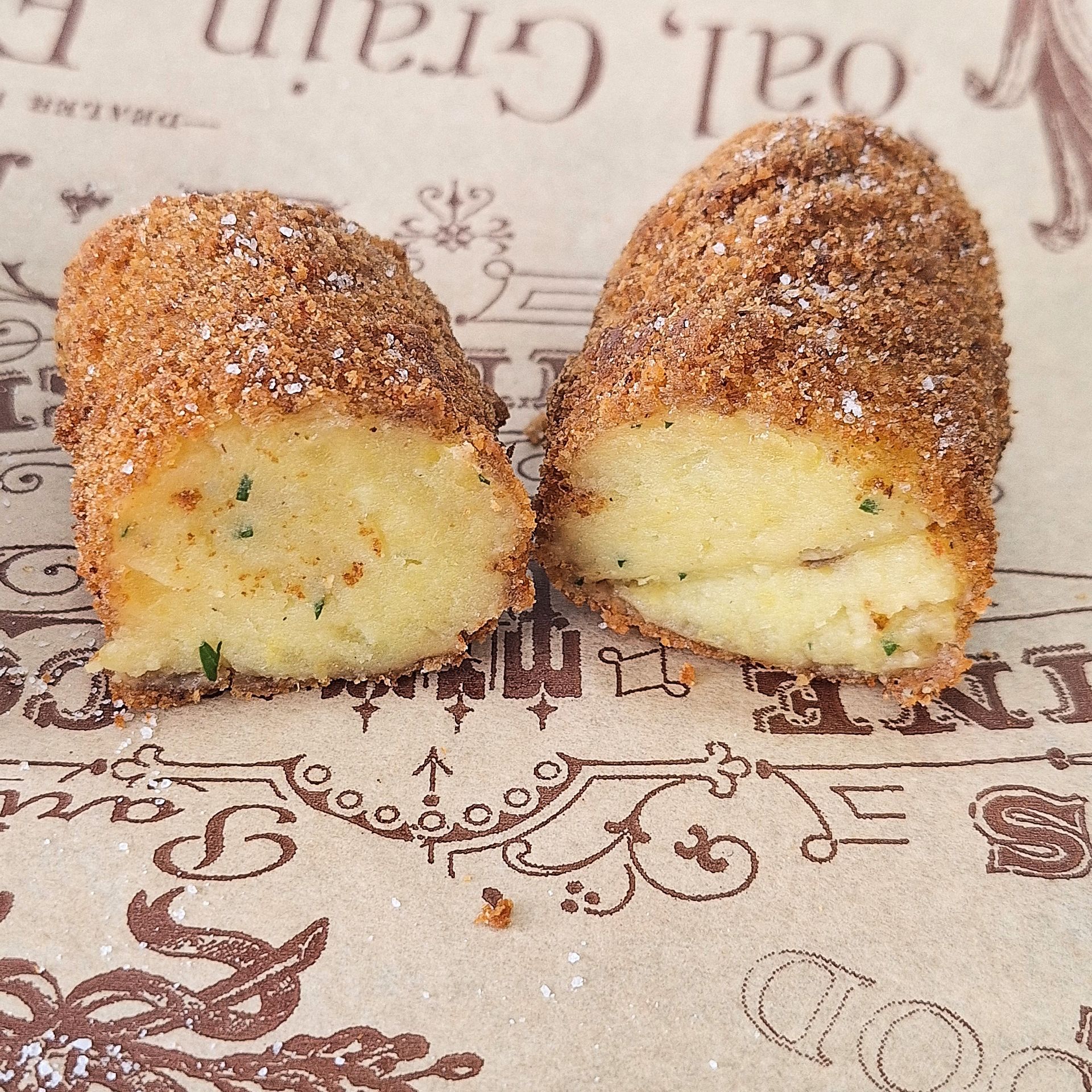 Fiordilatte di Agerola, Crocchè di patate, Prosciutto cotto, Panna, Basilico, Olio Evo